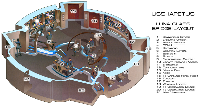 Description | The latest bridge configuration of the USS Iapetus follows one of the standard bridge designs for fleetwide application in newer starships. The central area of the Main Bridge provides seating and information displays for the Captain and two other officers, and is surrounded by an oak-effect railing similar to that seen on a Galaxy class starship. The computer interface panel on the uppermost part of the railing is a multi-purpose console labelled as 'Mission Ops', which is manned as necessary. The two Officer seats either side of the Captain's are equipped with fully programmable consoles for a variety of uses. Directly in front of the command chairs is the large helm console, following the same design ethos as the Intrepid line of ships of providing the pilot of the vessel maximum space for control manipulation and system feedback, and providing a chair fixed to a rail to allow the officer to move between either end of the console as required. Directly in front of the helm and attached to the forward bulkhead of the bridge is the main viewscreen, which can be utilised for a number of different purposes, the primary one of which to provide the bridge crew a visual representation of the space around the ship via external cameras mounted on the ship's hull. To either side of the helm and on a higher level are the Operations and Security/Tactical consoles, each freestanding and configured in such a way that the officer manning them can choose to either stand or sit to perform their duties. Behind each of these stations are a number of consoles mounted directly onto the bulkheads of the bridge; science stations and environmental control on the starboard side, behind Operations, and engineering, communications and a library access console along the bulkhead to port, behind tactical. To the rear bulkhead of the bridge is mounted a large Master Systems Display for monitoring of all ship's systems which can also be utilised to help coordinate internal operations such as anti-boarding or search-and-detain intruder scenarios. The bridge has five exits; the two towards the bow of the ship both lead to the conference room, or 'Observation Lounge' at the very front of deck one, off of which can be found an additional turbolift for transit through the ship. Either side of the MSD at the rear of the bridge are two turbolifts for direct access to the bridge. To the starboard side of the rear of the bridge is a recessed doorway which leads to the Captain's ready room. The comparable space on the port-side bulkhead is occupied by an emergency weapons locker, which rotates into the wall to secure the weapons from view and from access when they are not required. |