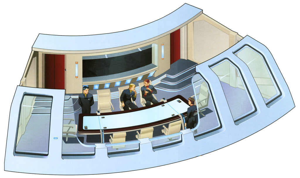 Description | On any Starfleet ship, a well equipped and private briefing room is essential. Though the ship is equipped with a number of conference rooms of varying specification, the captain and senior officers need a dedicated area, away from the rest of the crew, in which they can discuss orders without fear of interruption, make plans for forthcoming missions and consider other points relating to the general running of the ship. The observation lounge is located at the very front of deck one, and provides easy and immediate access onto the bridge should any crisis develop during a meeting. The Luna class observation lounge is equipped with a long conference table whose curvature matches that of the exterior hull and provides seating an basic LCARS control interfaces for ten individuals. Two display screens are located at either end of the room along with a pair of replicators, and one large mission briefing screen is located on the aft bulkhead, opposite the viewports which face out over the bow of the ship. As this terminal is one of the few visual access points on the ship designed for viewing by an entire room that allows visual access to materials which may go above the security clearance level of officers present (at the captain's discretion when mission-critical), a security feature of the main briefing screen is that it is permanently blank when not in use or when the room is emptied until it is manually activated, thus preventing data from being left on the screen and viewed by the next individual to enter the room. |