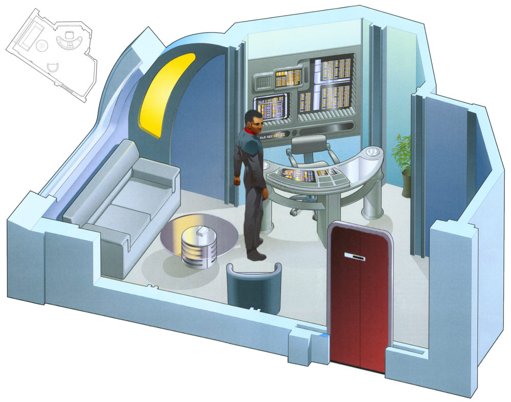 Description | Slightly smaller than the Captain's and the First Officer's rooms, each department head aboard a starship has his or her own office space, and each is configured slightly differently based upon their needs and the duties of their department. With the exception of the chief engineer's and chief medical officers offices (which are both located within or just off their areas of primary responsibility onboard the ship), the standard configuration of a department head office consists of: A suitably large desk facing the door that as standard is over 50% covered in control surfaces and data screens. Behind the desk and manufactured into the bulkhead is a large control and data viewing panel to enable the officer to maximise the visual space that they can project their work on to. A small alcove as part of the structure of this panel is for use as a replicator. Along the wall occupied by the external viewport is usually a low couch and a coffee table in order to work in a more relaxed posture or to conduct more informal meetings, and one small chair is present, able to be moved between the coffee table and the front of the officer's desk. Many department heads decorate their offices with objects of personal value, and some have the office space reconfigured completely, with the work being conducted by the engineering department. |